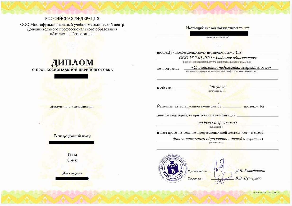 • «Педагог-дефектолог» с правом осуществления профессиональной деятельности в сфере дополнительного образования детей и взрослых
