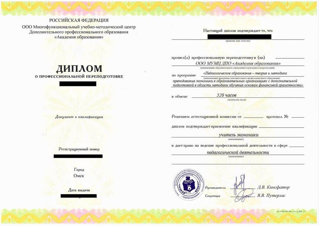 • «Учитель экономики», с правом работы в сфере педагогической деятельности